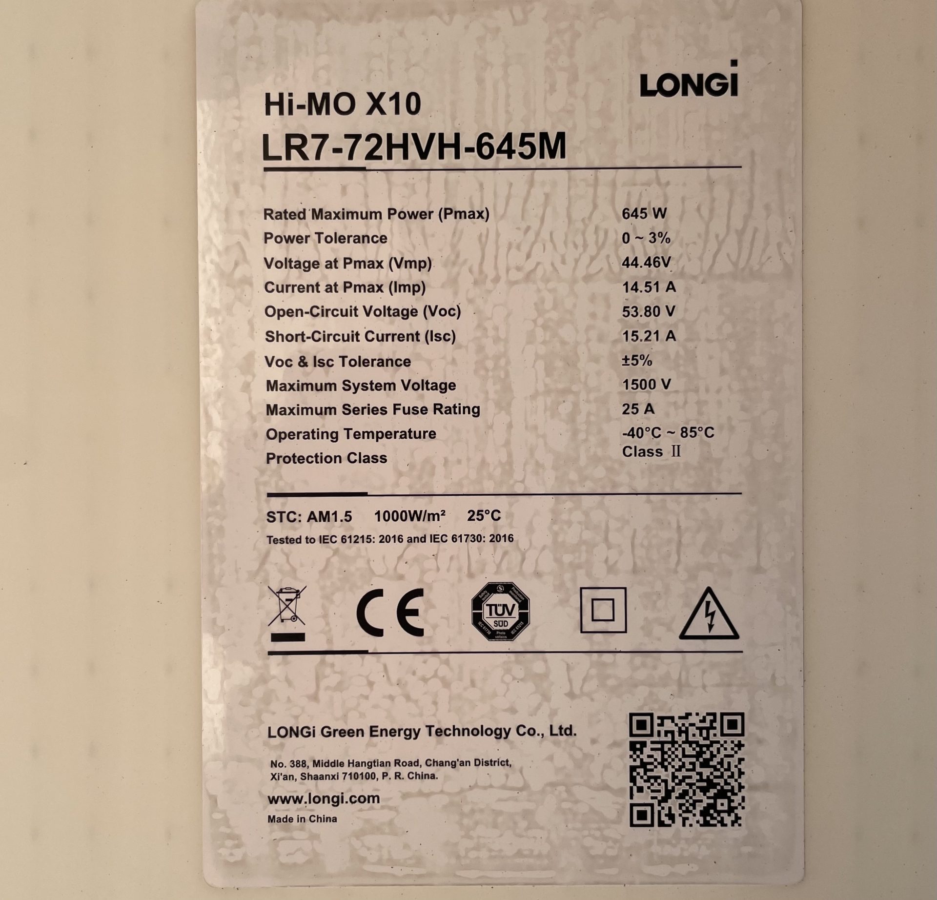 Модель LR7-72HVH-645M имеет мощность 645 Вт, произведена по последней, и самой современной (на март 2025 года) технологии HPBC2.0.